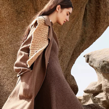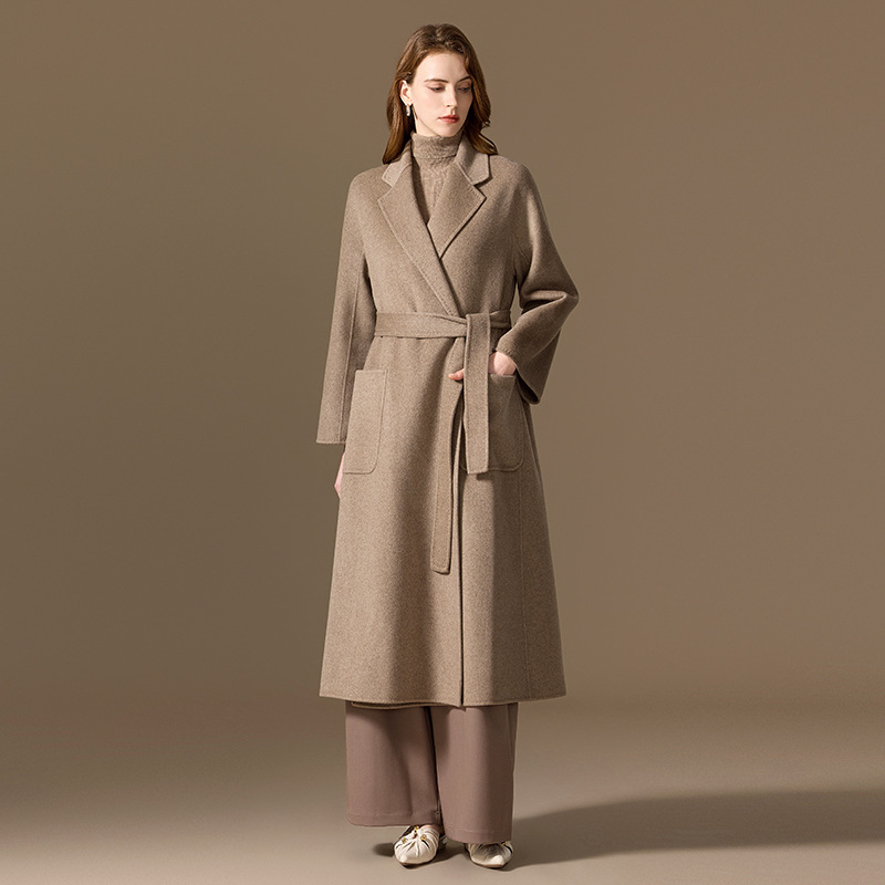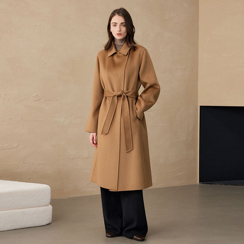 100801宽缝骆驼绒大衣高级感双排扣腰带长款气质双面毛呢羊毛外套