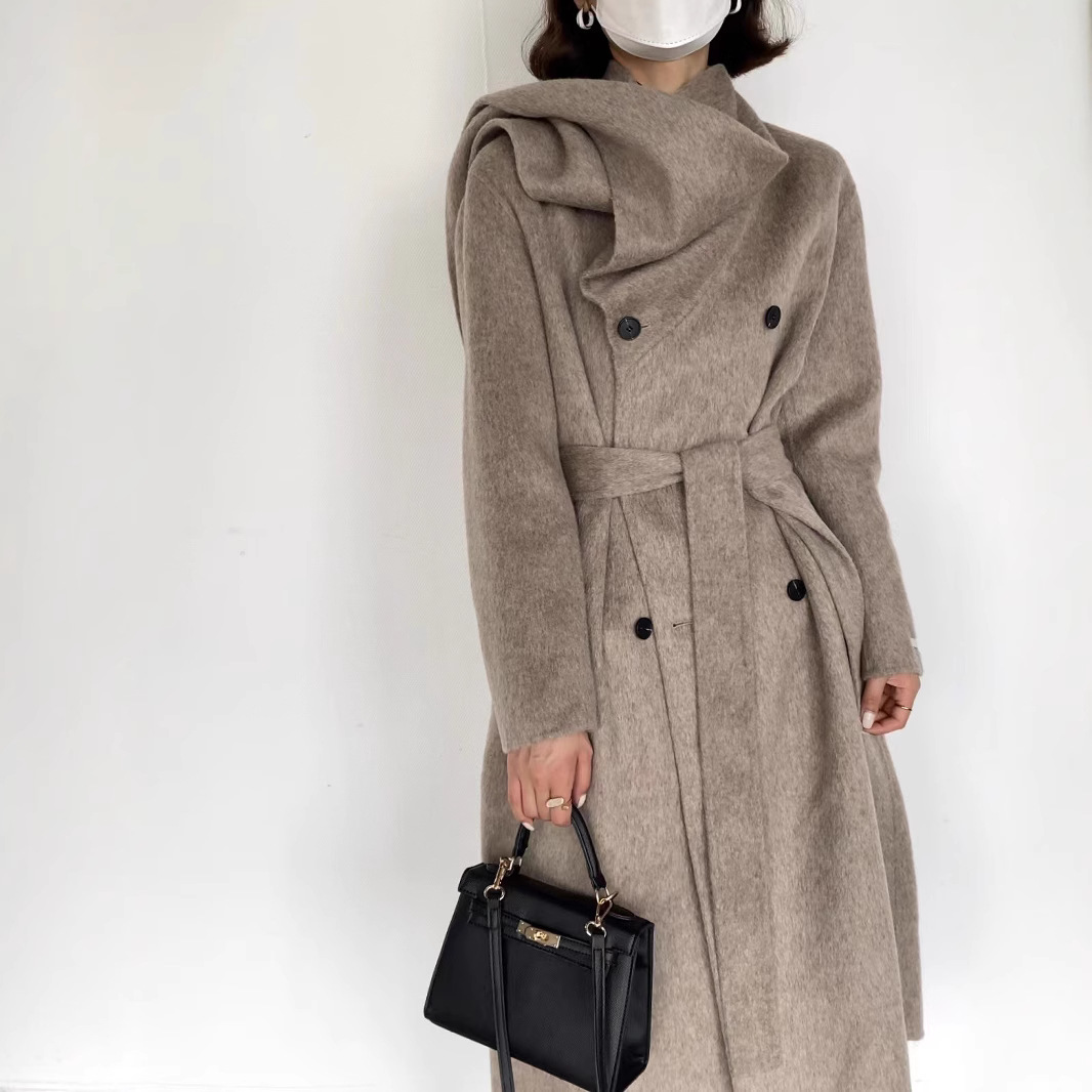 秋冬走秀设计围巾款双面羊毛大衣双排扣轻奢长款外套25年女