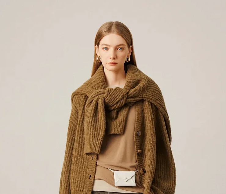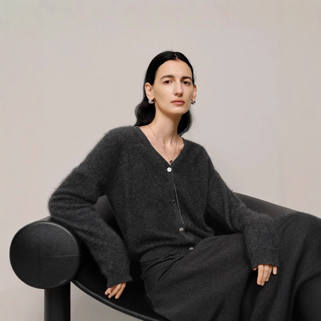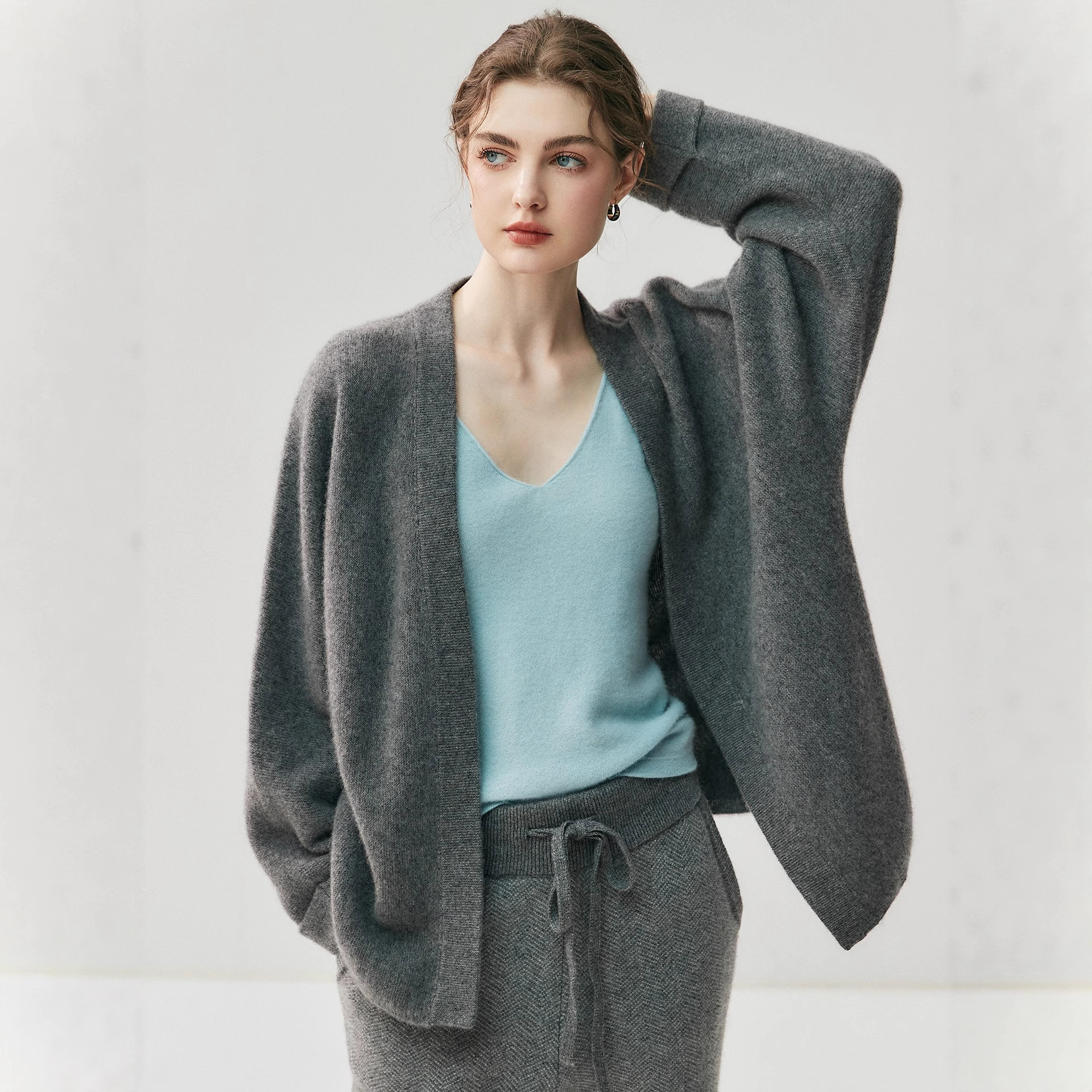 新款山羊羊毛绒开衫女气质灰针织秋冬披肩宽松慵懒风毛衣外套跨境