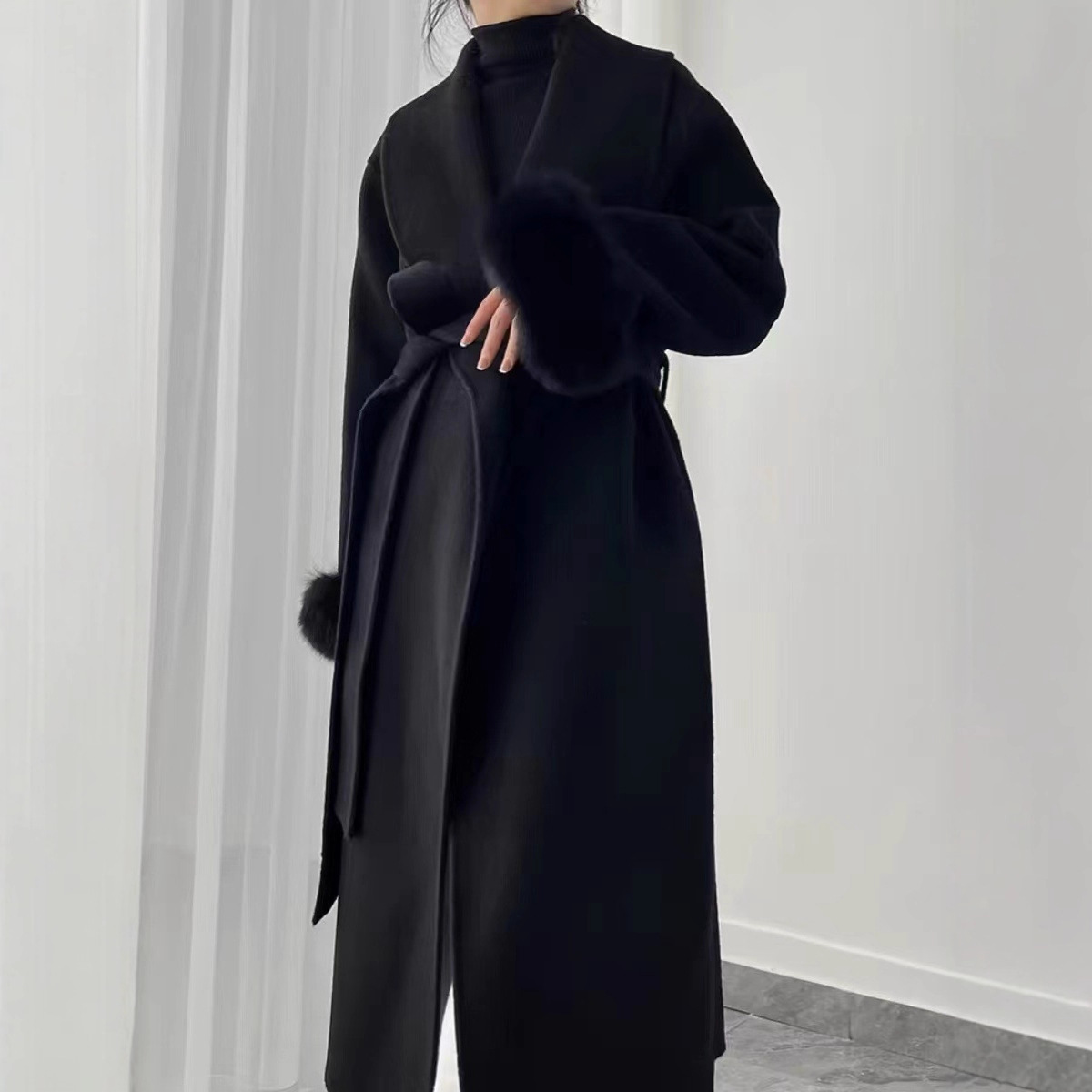 狐狸毛袖大衣女双面羊绒2025秋冬新款高端显瘦长款羊毛呢外套女装